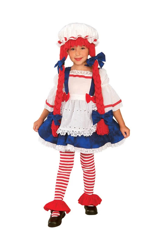 Das Stoffpuppen Kinderkostüm bestehend aus Mützchen mit Haaren und Zöpfchen und einem Kleidchen mit Schürze ist ein bezauberndes Kostüm für kleine Strolche. Die knallroten Zöpfchen, haben jeweils zwei blaue Schleifen. Das kurze Kleidchen hat einen weißen Saum. Das Waschbär Kleinkinder Kostüm und das Süßes Kätzchen Premium Kostüm sind ebenfalls beachtenswert.