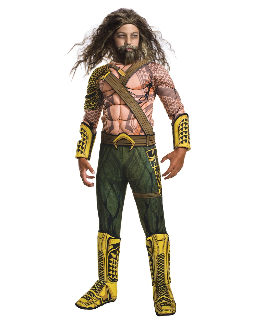 Das Aquaman Kostüm für Jungen besteht aus einem hautfarbenen Overall mit dunkelgrünen Applikationen. Am Oberkörper sind Muskeln, Fischschuppen und ein Gurt aufgedruckt. Der untere Bereich hat die Optik einer Hose. Angebrachte gelbe Schuhüberzieher und ein Gürtel runden das Aquaman Kostüm für Jungen perfekt ab. Auch Männer finden mit unserem DLX Aquaman Kostüm das passende Superhelden Karnevalskostüm.
