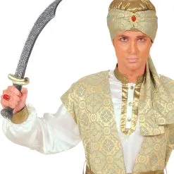 Der Ararber Säbel ist eine Spielzeugwaffe die mit ihren ca. 46 cm, der silberfarbenen Klinge und dem schwarz/goldfarbenen Griff einer echten Stichwaffe in Nichts nachsteht und so sehr vielseitig mit diversen Karnevals Kostümen kombiniert werden kann.. Es ist egal, ob du dich für ein Arabischer Prinz Kostüm oder ein Caribbean Piratenkostüm Deluxe entscheidest – du wirst unseren Arabischen Dolch unbedingt brauchen