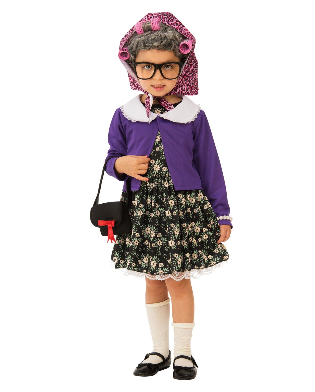 Unser Großmutter Kostüm für Kinder zeigt das Outfit einer alten Dame mit Stil. Das Kostümkleid der Oma Verkleidung macht richtig was her. Es besteht aus einem hübsch bedruckten Stoff mit Blümchenmuster. Alles in sehr dezenten Farben natürlich. Eine Dame in diesem Alter weiß schließlich, wie man sich anständig kleidet. Deshalb kommt auch der Sweater zum Überziehen in dunklem Lila daher. Lila – der letzte Versuch, sagt man ja immer so schön. In diesem Fall stimmt das natürlich keineswegs. Das Kostüm begeistert durch die fabelhafte Ironie, ein Kind als Oma zu verkleiden! Diese einzigartige Kostümidee wird bei Kostümpartys oder beim Fasching für Begeisterung sorgen. Vor allem, weil der Style der alten Oma durch das Kopfteil mit grauem Lockenkopf unter einem pinkfarbenen Kopftuch und mit pinken Lockenwicklern so täuschend echt aussieht. Passend dazu empfehlen wir die Brille mit runden Gläsern, die sich durch ihre runde Form ideal für den alte Dame Look eignet.