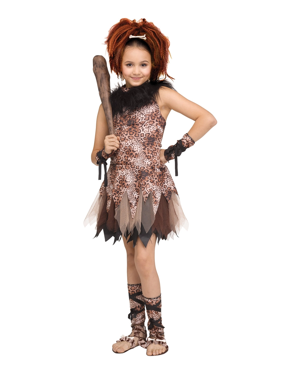 Das Höhlenmädchen Kinderkostüm besteht aus Kleid, Arm- und Beinstulpen. Das armfreie, knapp über den Knien endende Kleid der Faschings-Verkleidung für Kinder weist eine freche Leopardenmusterung und gezackte Säume auf für eine altertümliche Optik. Dichter Kunstfellbesatz an der Halspartie des Neandertaler-Kinderkostüms fügt sich perfekt in den Steinzeit-Stil der Verkleidung ein. Arm- und Beinstulpen, ebenfalls im Leopardenstil gemustert und in Lederoptik gehalten, runden deine Höhlenmensch-Verkleidung stimmig ab. Kleine Knochen an den Beinstulpen dienen als passender Schmuck für deine Kostümierung als Höhlenmädchen. Dazu passen die Steinzeit Keule und die Neandertaler Ohrringe.