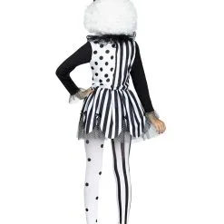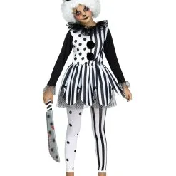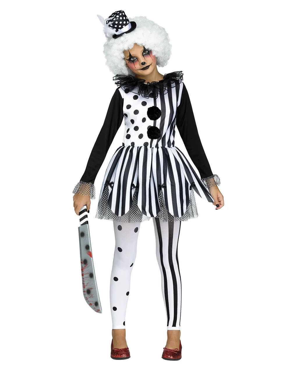 Das 3-teilige Kinderkostüm Killer Clown macht aus ihr von Kopf bis Fuß einen Harlekin, der sich an Halloween die meisten Süßigkeiten angelt – Garantiert. Der toll gearbeitete Kunststoff Haarreifen mit dem Mini-Hut, der mit Kunstfedern & Dekostein super schön verziert wurde, ist ein echter Hingucker. Genau wie das schwarz/weiß Kostüm und die Leggings mit zwei verschiedenen Beinmustern.