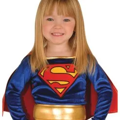 Das Kinderkostüm Supergirl ist für kleine Mädchen, etwa im Kindergartenalter. Es besteht aus einem Kleid mit angenähtem Cape und einem Paar Stiefel-Überziehern. Auf dem blauen Oberteil des Kleides prangt das Superman Logo, der Rock ist rot. Dazwischen ist ein goldener Gürtel angebracht. Auch die Stiefel-Überzieher sind rot mit einem goldenen Rand. Das Kostüm ist aus einem glänzenden Stoff gefertigt. Auch für kleine Jungs haben wir mit Superman Babykostüm das passende Kostüm, andere Kostüm-Ideen für kleine Mädchen sind das Kinderkostüm Teufel und das Clown Kostüm für Mädchen.