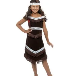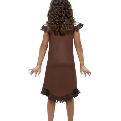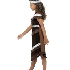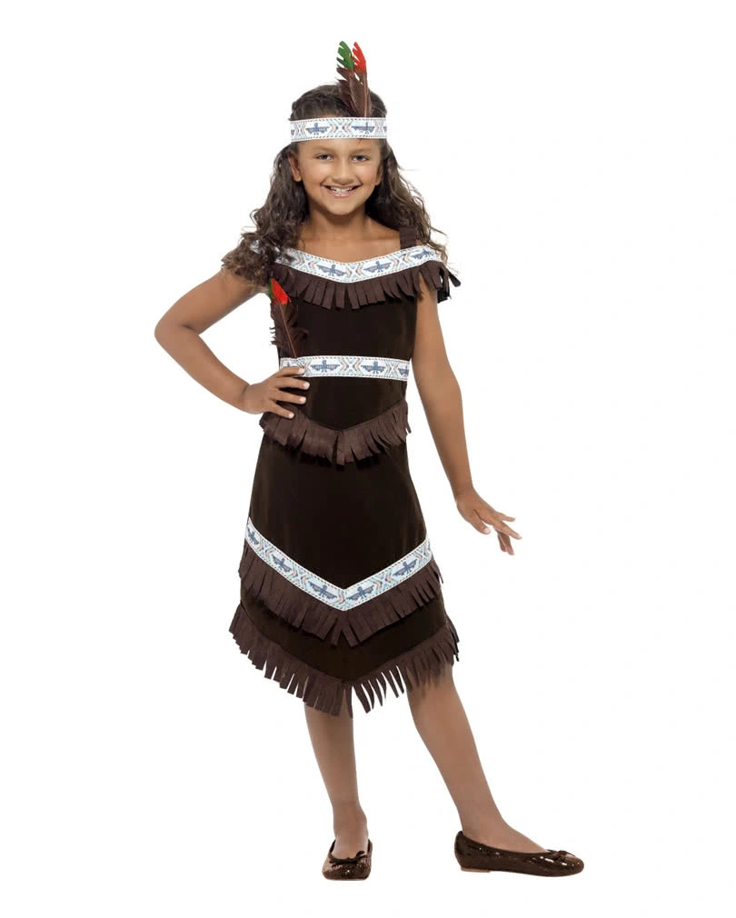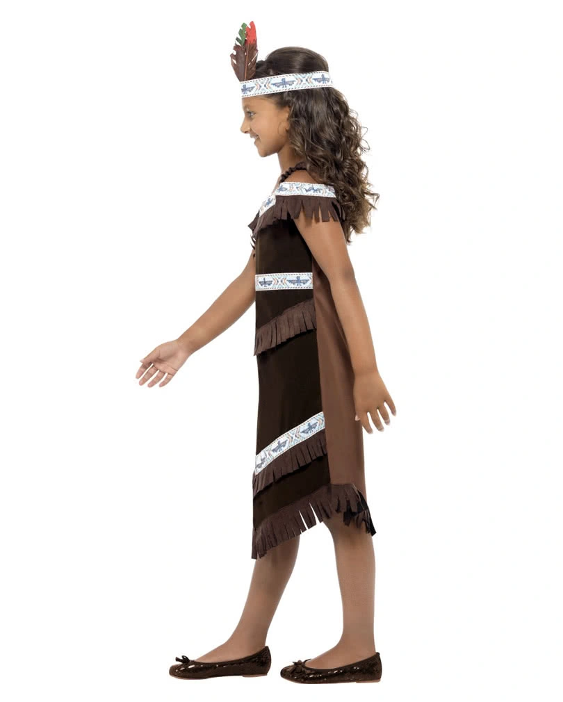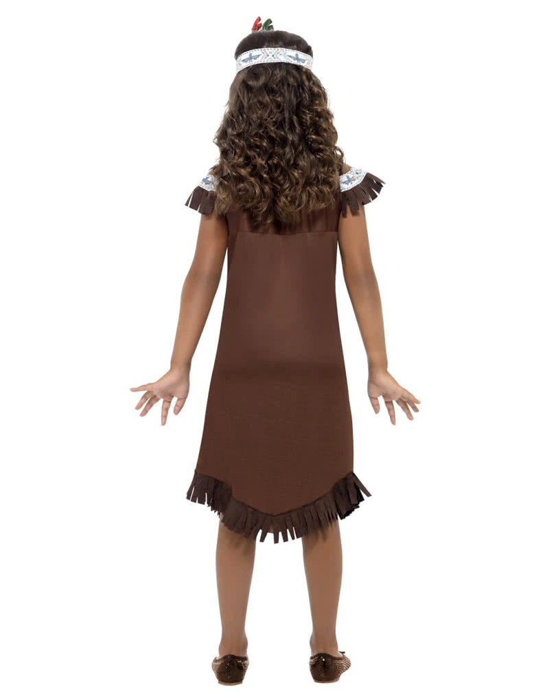 Das preiswerte Indianerin Mädchenkostüm besteht aus einem braunen Kleid mit Fransen, das auf der Vorder- und Seitenseite reichlich verziert ist, während die Rückseite ohne spezielle Applikationen und Stickerei auskommt. Das im Lieferumfang enthaltene Stirnband mit Federn passt farblich abgestimmt zur dekorativen Bordüre des Kostüms.