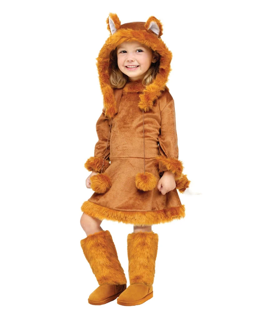 Das flauschige Faschingskostüm besteht aus einem Kleid, einer Mütze mit Ohren und Bommeln, einem Fuchsschwanz und den Stiefelstulpen. Für die Kragen- und Mützenverzierung wurde Fellimitat benutzt. Der kleine Schwanz des Kleinkindkostüms niedlicher Fuchs besteht komplett aus Kunstfell und kann leicht am Kleid befestigt werden. Für die größeren Kinder gibt es das Süsse Füchsin Kostüm.
