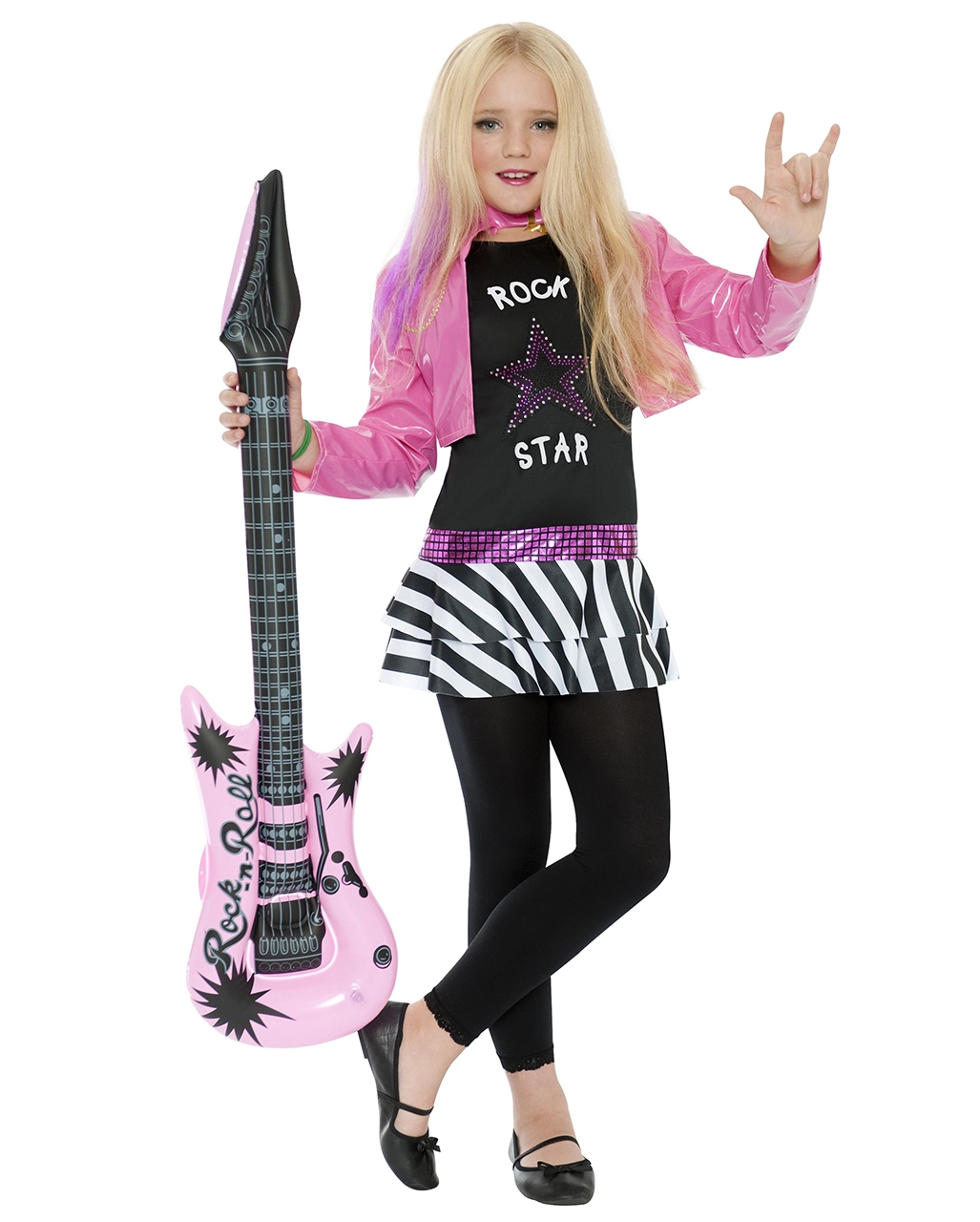 Das Mini Rockstar Kostüm für Mädchen besteht aus einem langen Oberteil mit angenähtem Rock. Auf dem Oberteil ist ein großer Stern mit schwarzen, rosanen und pinken Glitzersteinen angebracht und es ist der Schriftzug ” Rock Star” aufgedruckt. Der angenähte Rock ist schwarz-weiß gestreift und darüber ist ein lila glizerndes Band angebracht in Gürtel Optik. Mitgeliefert wird auch eine pinke Jacke im Lederjacken Look mit einer goldenen Verzierung auf der linken Seite.