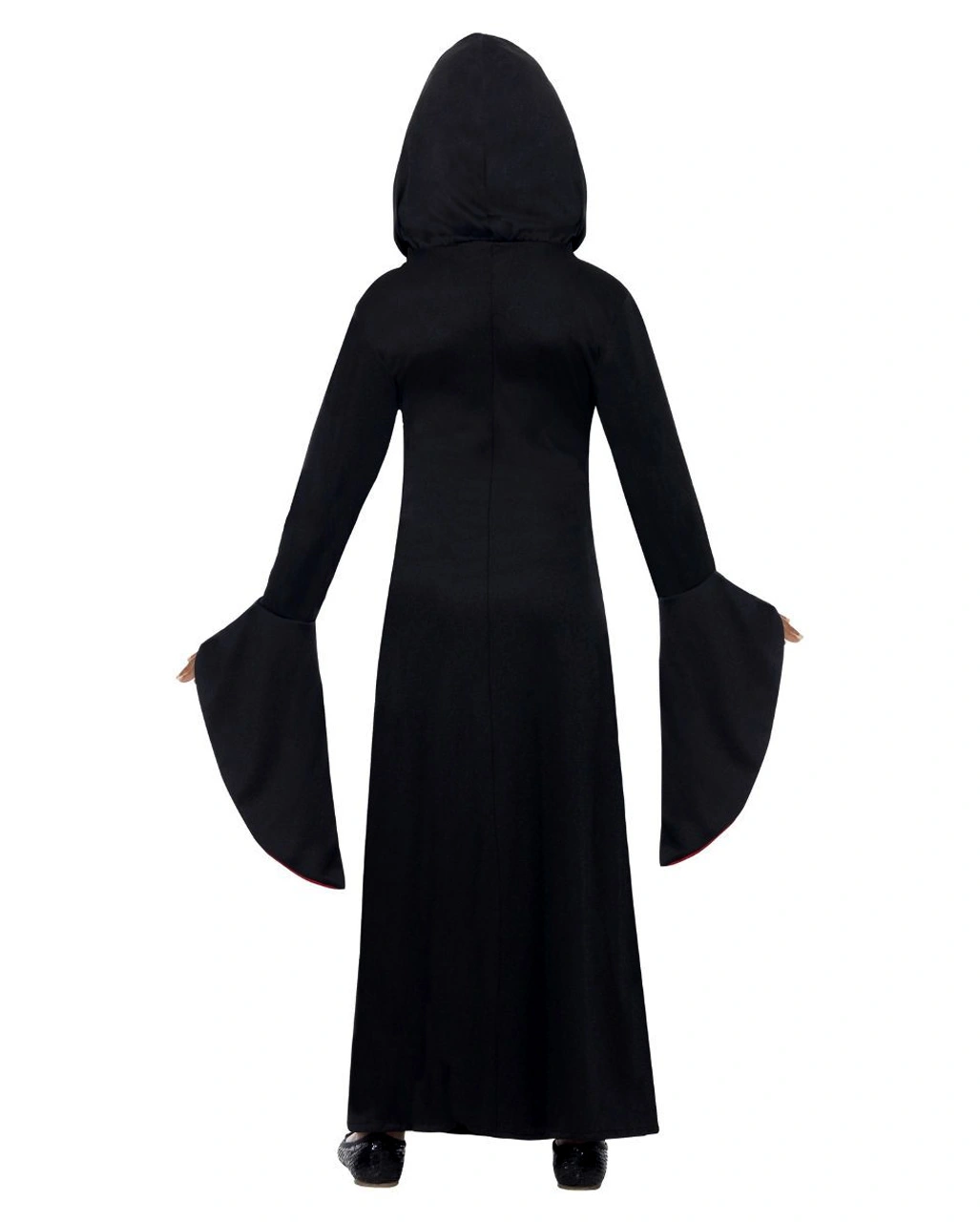 Das Mittelalter Vampir Kinderkostüm mit angenähter Kapuze ist ein schwarz-rotes, bodenlanges Kleid im Märchen-Look. Die angedeutete Corsagenschnürung und die langen, ausgestellten Ärmel sowie das rote Innenfutter machen das Mittelalterkleid zu einem echten Blickfang. Der Kontrast zwischen schwarz und rot wirkt sehr geheimnisvoll. Ergänzend empfehlen wir dasdas 4-tlg.Schwarz-Weiß Make Up Set und die grausigen Kunststoff Spinnen 36 Stück.