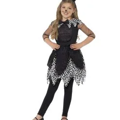 Das Mitternachtskatze Mädchenkostüm ist zweitteilig und besteht aus einem schwarzen Haarreif mit glitzernden Katzenohren und einem schicken schwarzen Kleid mit halblangen schwarzen Tüllärmeln mit silbernen Glitzerpunkten. Der Halsausschnitt ist mit einem spitz zugeschnittenen Kragen im weiß-schwarzen Leopardenlook und einer schwarzen Fliege verziert. Das schwarze Oberteil hat das katzentypische Lätzchen aus Glitzerstoff. Der weiße Rock ist im Leopardenlook und hat eine darübergelegte schwarze Tüllstoffschicht, die glitzert und drei schwarze darübergelegte Glitzervolants. Auf der Rückseite des Kleids ist ein kurzer, schwarz glitzernden Katernschwanz angebracht. Für den Partnerlook mit der Mama, empfehlen wir das Sexy Cat Kostüm Gr. 36-38 S/M.