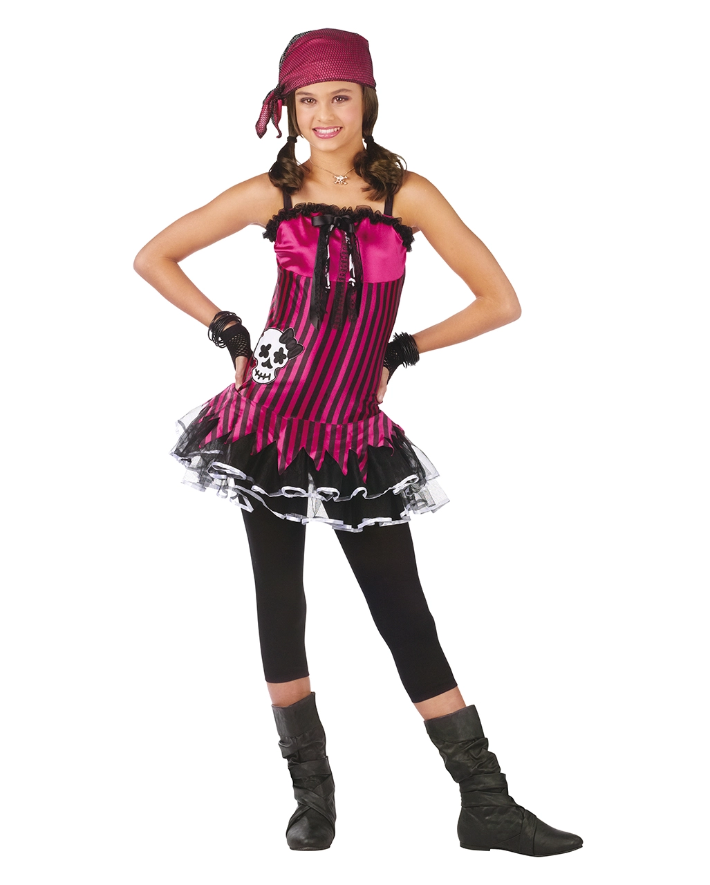 Das Piratinnen Kostüm besteht aus dem Minikleid, den Netzhandstulpen, der Leggings sowie dem pinken Netzbandana. Das schwarz pink gestreifte Kleid ist reich mit Spitze und Rüschen besetzt sowie mit einem aufgenähten süßen Totenschädel verziert. Weitere Piraten Kostüme wie das Romantische Lolita Teenager Kostüm oder das Karibik Piratenkostüm mit Stiefelstulpen gibt es im Karneval Shop.