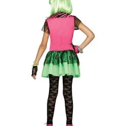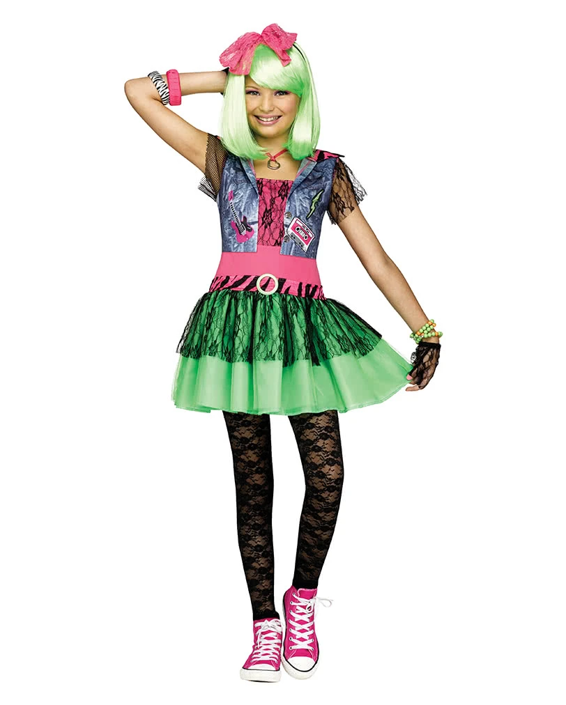 Das Rockkostüm für Kinder besteht aus mehreren Teilen. Das Kleid mit schrillem pinken Oberteil und giftgrünem Rock weist eine stilisierte, passend gestaltete Jeansjacke auf. Netzapplikationen an Schultern, Dekolleté und Rock schmücken das Rockstar Fastnachtkostüm zusätzlich. Die pinke Schleife wird mittels eines Haarreifs einfach ins Haar gesteckt. Zwei fingerlose Netzhandschuhe komplettieren das Bild eines Rockstars. Weitere geniale Kostüme für Kinder wie das Zombie Punk Rocker Girl Kinderkostüm und das Kleiner Biker Kinderkostüm haben wir ebenfalls auf Karneval-Universe.de!