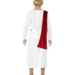 Das Römischer Kaiser Kinderkostüm besteht aus einem goldenen Lorbeer-Stirnband, einem braun-weißen Gürtel mit Goldbordüre und einer weißen Toga. An der Toga ist eine purpurne Schärpe festgenäht, die bis über die rechte Schulter reicht. Der Halsausschnitt der Toga ist mit einer Goldbordüre verziert. Verschlossen wird die Toga auf dem Rücken mit Klettverschlüssen. Für den Partnerlook mit dem Papa empfehlen wir das Cäsar Kostümrobe mit Schärpe & Lorbeerkranz.