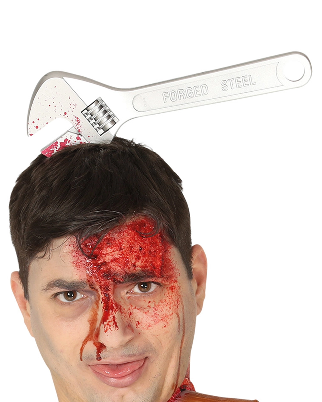 Wenn dir ein halbtoter Typ mit Schraubenschlüssel im Schädel entgegen kommt, ist der Horror-Mechaniker nicht weit. Am besten läufst du um dein Leben, damit dich der psychopatische Killer nicht auch erwischt. Außer, du suchst ein blutiges Halloween Kostümzubehör. Dann ist unser blutiger Schraubenschlüssel im Schädel ideal geeignet. Die authentische Mechaniker Waffe als Kopfschmuck macht dich zum Opfer eines bestialischen Serienmörders. Pimpe den Horror Kopfschmuck mit etwas Kunstblut auf!