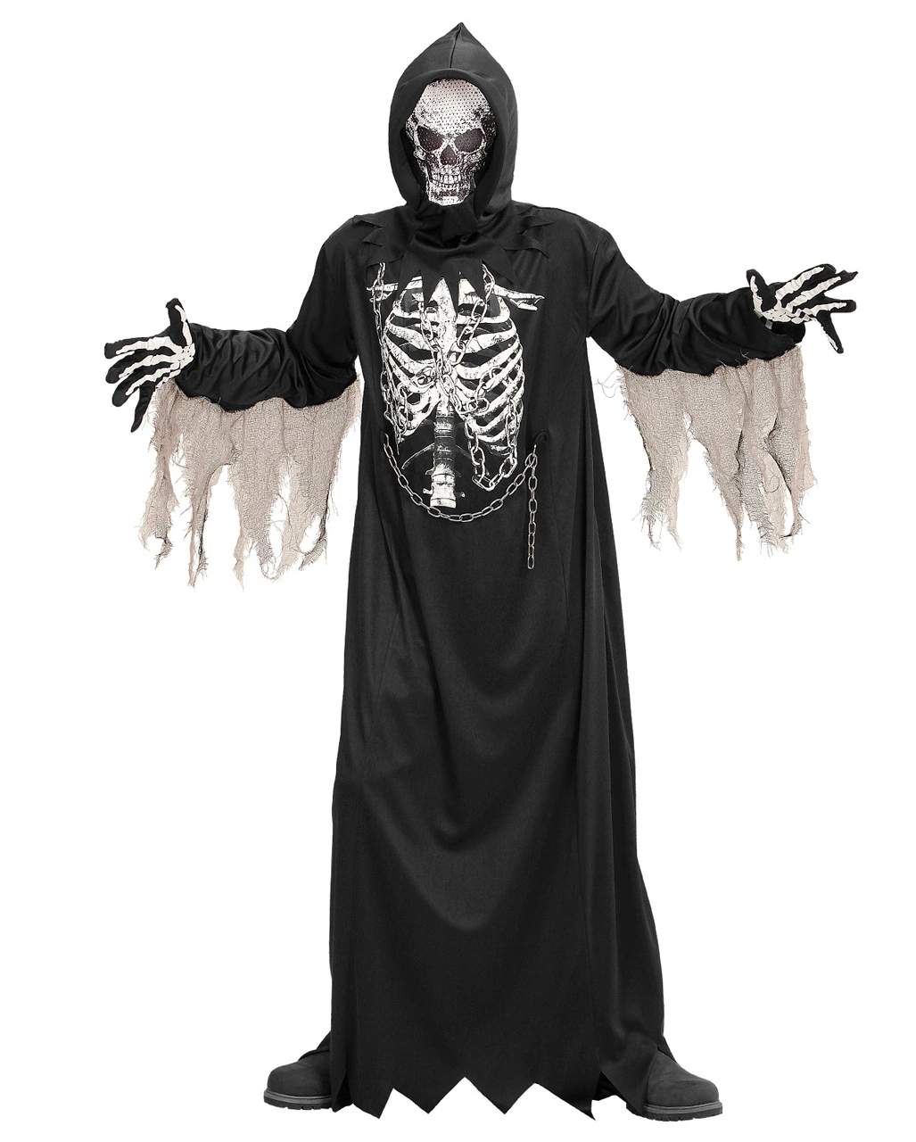 Verkörpere mit unserer Sensenmann Kutte mit Kette einen furchterregenden Totengeist! Das mit Print und Fransen aufwändig designte Grim Reaper Kostüm wird dir auf den kommenden Halloween Feiern und Gruselpartys unter Garantie spitze Schreie des Entsetzens bescheren!