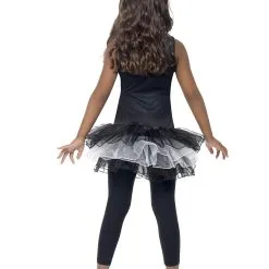 Das Skelett Ballerina Kinderkostüm besteht aus einem schwarzen Kleid mit schwarz-weißem Tutu aus mehreren Tüll Schichten. Auf der Vorderseite des Kleides ist ein weißer Skelett Oberkörper aufgedruckt. Kombiniere das Kostüm deines Kindes mit mit dem Family Skelett Make Up Set und der Schwarze Kinder Leggings.