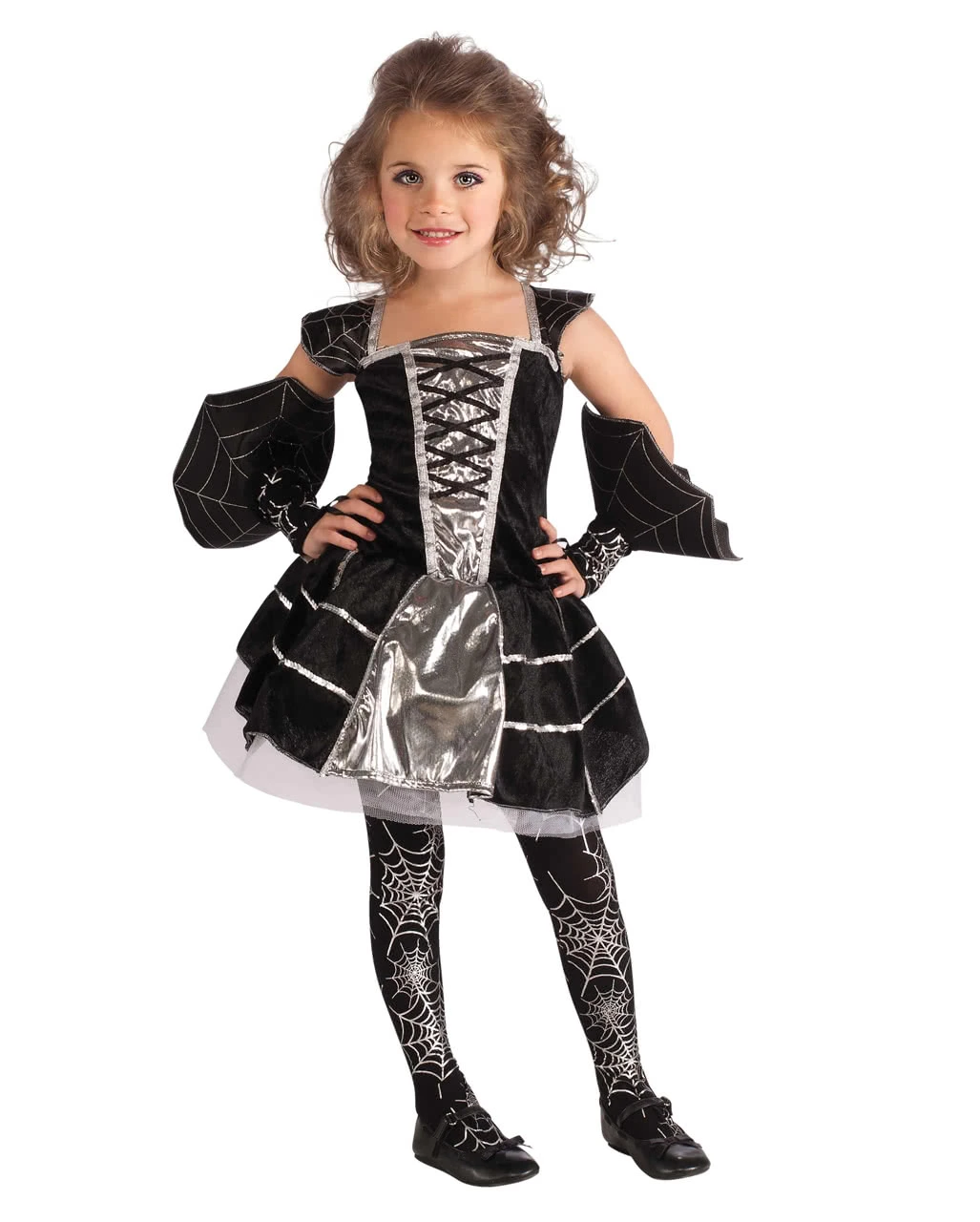 Das 3-teilige Spiderella Kinderkostüm besteht aus einem schwarz/silbernem Kleid, Strumpfhose und Armstulpen im Spinnennetz-Look und ist ein wunderschönes Mädchenkostüm. Das Kleidchen hat schmale Träger mit Schulterpolster im Spinnweben Design. An der Brust befindet sich eine schwarze Schnürung, unter dem Kleid ist Tüllstoff verarbeitet.