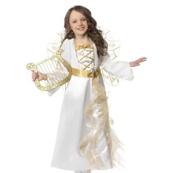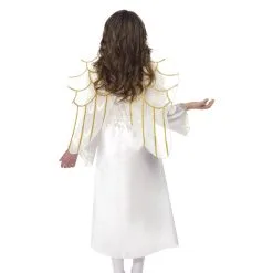 Das Süße Engelsprinzessin Kinderkostüm besteht aus einem silbernen Haarreif mit einem Heiligenschein aus weißen Federn und einem wunderschönen Satinkleid. Das weiße Kleid hat schöne Fledermausärmel, die am Oberarm einen Raffung haben. Das Oberteil hat einen mit goldenen Sternen verzierten Stoffeinsatz, der mit Goldborten und bronzenen Rüschen am Ausschnitt verziert ist. Links und rechts von dem Einsatz sind golden funkelnde Pailetten angebracht. Der Gummizuggürtel des Kleids ist bronze und hat auf der linken Seite einen großen Stern, von dem drei festgenähte, bronzene Volants am Kleid herabfließen. Verschlossen wird das Kleid mit Klettverschlüssen auf dem Rücken. Abgerundet wird das Kleid von den Weiße Engelsflügel 25 cm.
