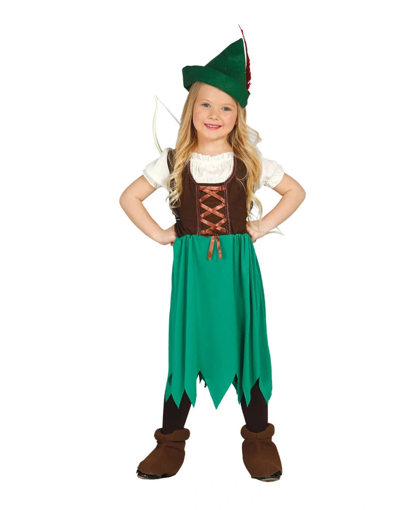 Das Süße Bogenschützin Mädchenkostüm ist zweiteilig und besteht aus einem grünen Filzhut mit einer roten Feder sowie einem süßen Kleidchen. Das Kleid hat eine eingenähte Bluse mit Gummizügen an Ausschnitt und den kurzen Ärmeln. Über der Bluse ist das braune Oberteil mit einer Zierschnürung auf der Vorderseite angebracht. Die Schnürung ist seitlich mit einer Schmuckborte verziert. Der süße Rock des Kleides ist grün und unten am Saum spitz zugeschnitten. Weitere zauberhafte Mädchenkostüme wie das Kinderkostüm Supergirl und das Freibeuter Mädchenkostüm findest du in unserem großen Sortiment.