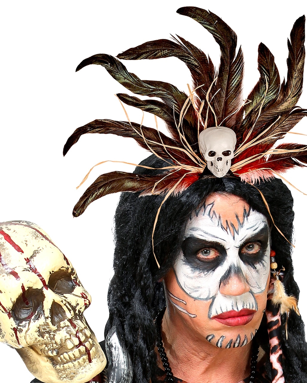 Der Voodoo Haarreif mit Totenschädel ist ein eindrucksvoller Kopfschmuck, der auf den ersten Blick durch den Einsatz der Federn besticht. Sie stehen vom Kopf ab wie eine Flammen-Corona. Auch die Farbgebung aus braunen Schattierungen über schwarz bis zum roten Mittelteil tut seine Wirkung. Herzstück des Kostümzubehörs aber ist der blanke Totenkopf.